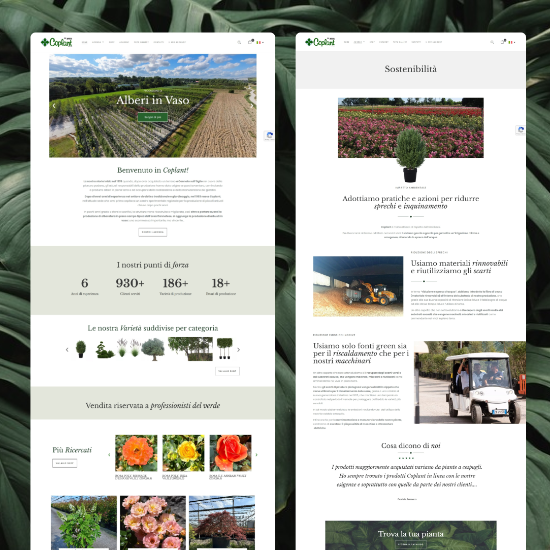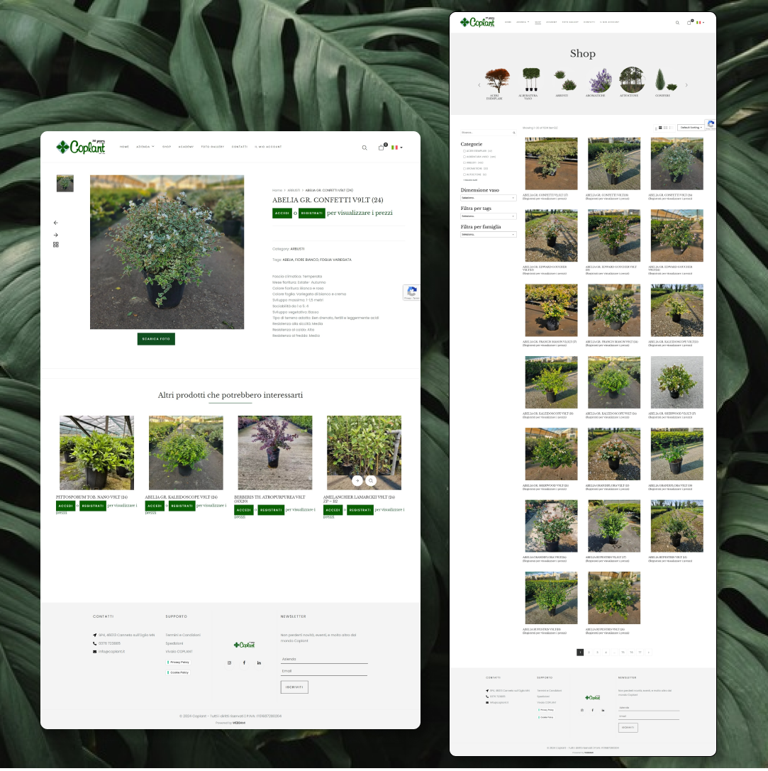 COPLANT, un’azienda leader nel settore dei vivai, aveva bisogno di un sito web che andasse oltre il semplice eCommerce. Il progetto richiedeva una piattaforma multifunzionale, in grado di gestire richieste di preventivo con prezzi differenziati per utenti B2B e B2C, e che fosse completamente integrata con il gestionale interno dell’azienda. Inoltre, il sito doveva includere sezioni dedicate a eventi, corsi e workshop, il tutto ottimizzato per garantire una forte presenza online.